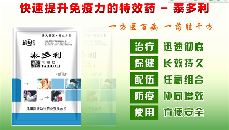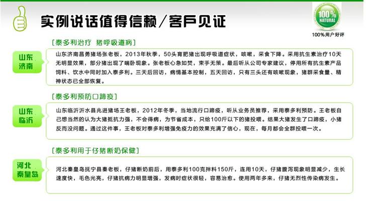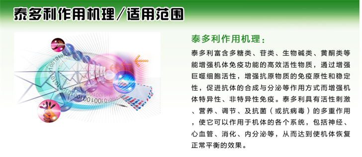 提高免疫力 就用泰多利一藥抗百病 泰多利作用機(jī)理:天然免疫增強(qiáng)劑---泰多利是一種天然、綠色、安全、高效的畜禽免疫調(diào)節(jié)劑。它的有效成分從天然植物中萃取而來,不含激素、無毒無害、無殘留,使用方便,功效顯著。泰多利富含多糖類、苷類、生物堿類、黃酮類等能增強(qiáng)機(jī)體免疫功能的高效活性物質(zhì),通過增強(qiáng)巨噬細(xì)胞活性,增強(qiáng)抗原物質(zhì)的免疫原性和穩(wěn)定性,促進(jìn)抗體的合成與分泌等作用方式而增強(qiáng)機(jī)體特異性、非特異性免疫。泰多利具有活性刺激、營養(yǎng)、調(diào)節(jié)、及抗菌(或抗病毒)的多重作用,使它可以作用于機(jī)體的各個系統(tǒng),包括神經(jīng)、心血管、消化、內(nèi)分泌等,從而達(dá)到使機(jī)體恢復(fù)正常平衡的效果。