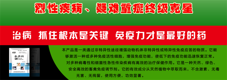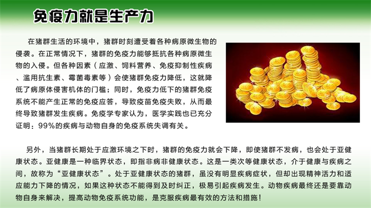 本產(chǎn)品是一類通過非特異性途徑增強(qiáng)動物機(jī)體非特異性或特異性免疫應(yīng)答的物質(zhì)。它能夠激活一種或多種免疫活性細(xì)胞,增強(qiáng)免疫功能,使低下的免疫功能迅速恢復(fù)正常。對多種病毒性和細(xì)菌性急性傳染疾病有高效的治療保健作用。 免疫力就是生產(chǎn)力 在豬群生活的環(huán)境中,豬群時刻遭受著各種病原微生物的侵襲。在正常情況下,豬群的免疫力能夠抵抗各種病原微生物的入侵。但各種因素使豬群免疫力降低后,就降低了病原體侵害機(jī)體的門檻;同時,免疫力低下的豬群免疫系統(tǒng)不能產(chǎn)生正常的免疫應(yīng)答,導(dǎo)致疫苗免疫失敗,從而最終導(dǎo)致豬群發(fā)生疾病。